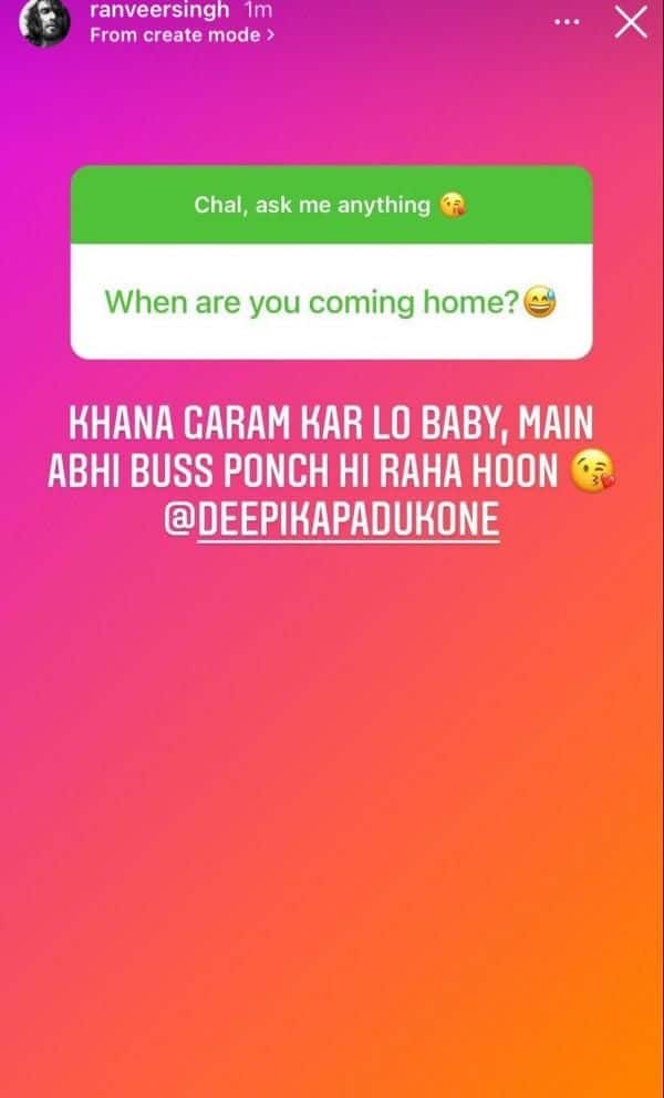 Ranveer Singh and Deepika Padukone are undeniably one of the most loved couples of the entertainment industry. While the duo often gives us major couple and relationship goals with their social media PDA, once again the beautiful couple won our hearts with their cute banter. The Takht actor kept an ‘Ask Me Anything’ session to interact with fans and we saw wifey Deepika crashing it and asked him “When are you coming home”? The actor gave an adorable yet witty reply as he wrote, “Khana Garam Kar Lo Baby, Main Abhi Buss Ponch Hi Rha Hoon.” with a kiss emoji. In the session, a fan asked Ranveer “One word for ur wifey?” To which he answered, “Queen”.