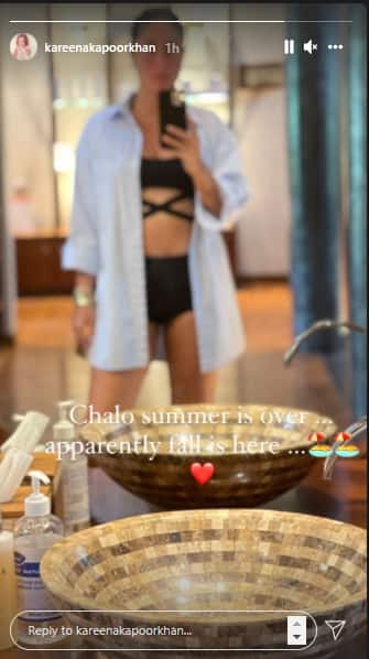 On Insta stories, Kareena Kapoor Khan shared a mirror selfie that sees her dressed in a strappy black bikini set. She has carried a white shirt along with it. She captioned it as, “Chalo summer is over… Apparently fall is here.” Guessing that it is time for their vacation to come to an end.